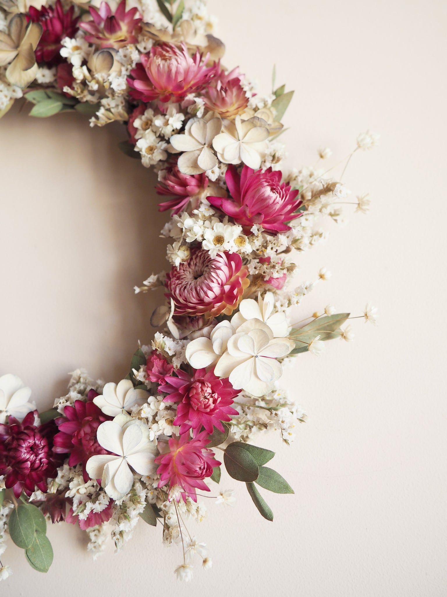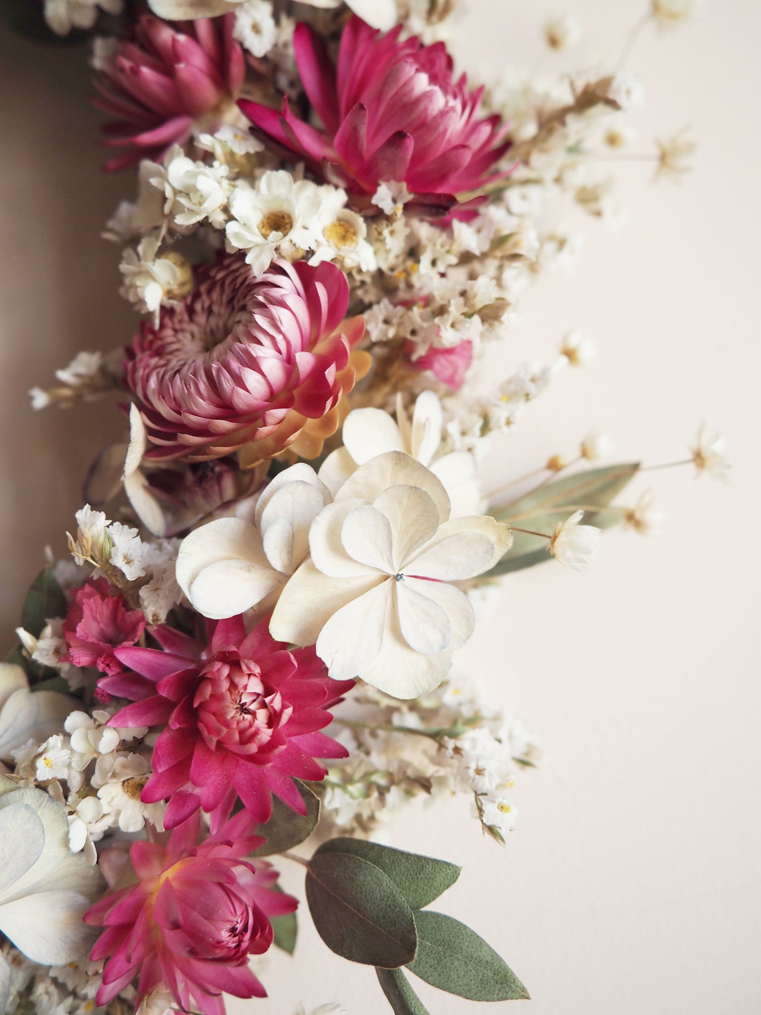 Cette jolie couronne est composée d’un délicat mélange de fleurs et feuillages roses et blancs.