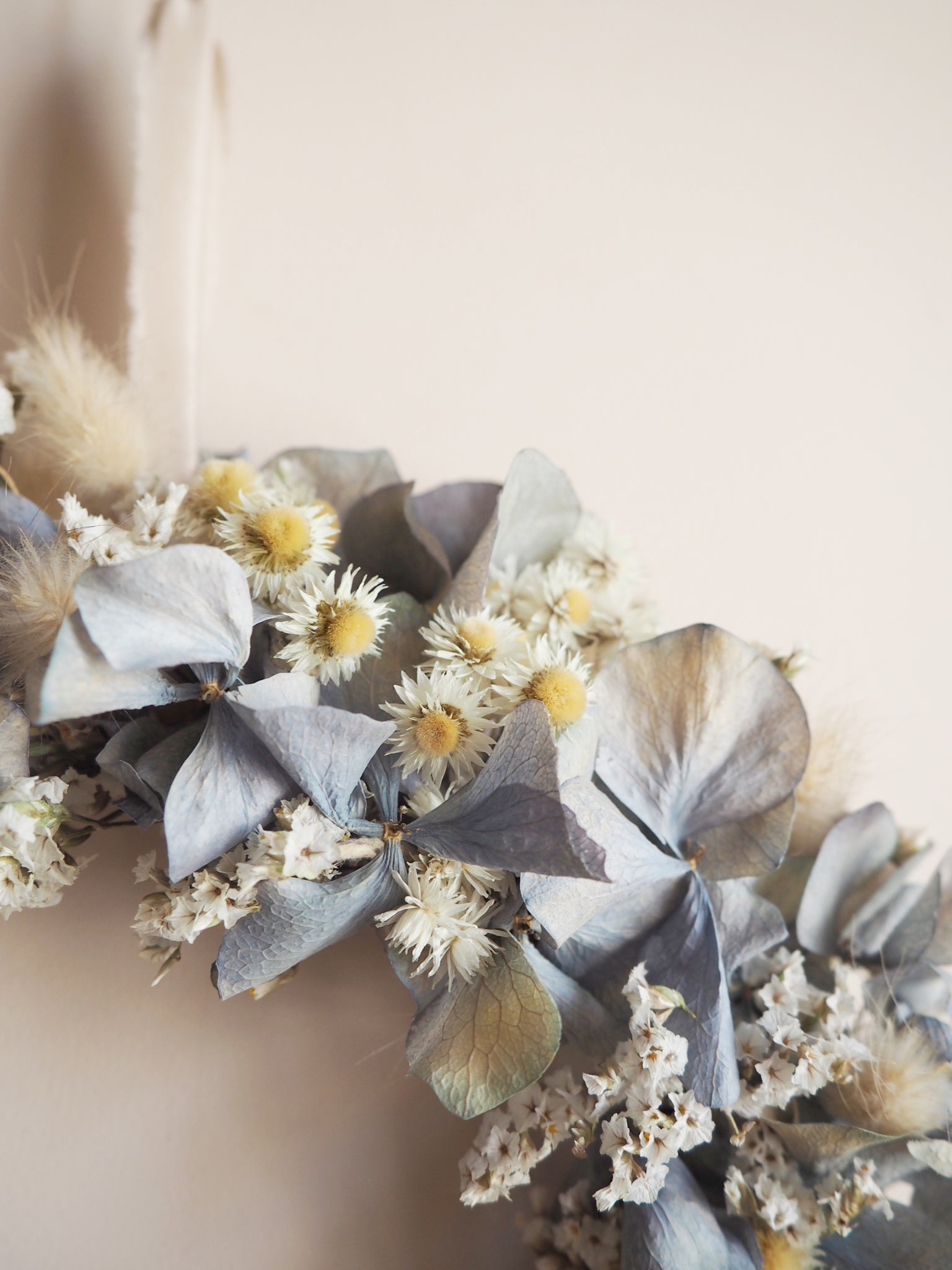 Cette jolie couronne est composée d’un délicat mélange de fleurs et feuillages bleus et blancs.